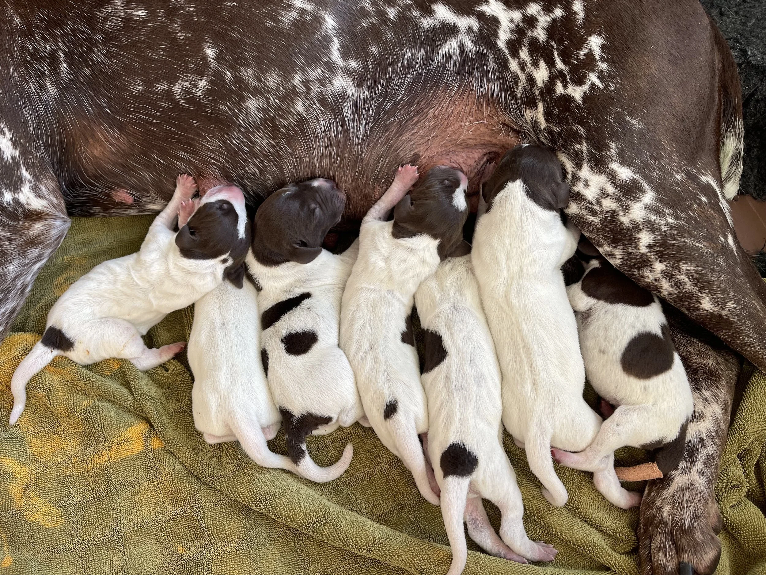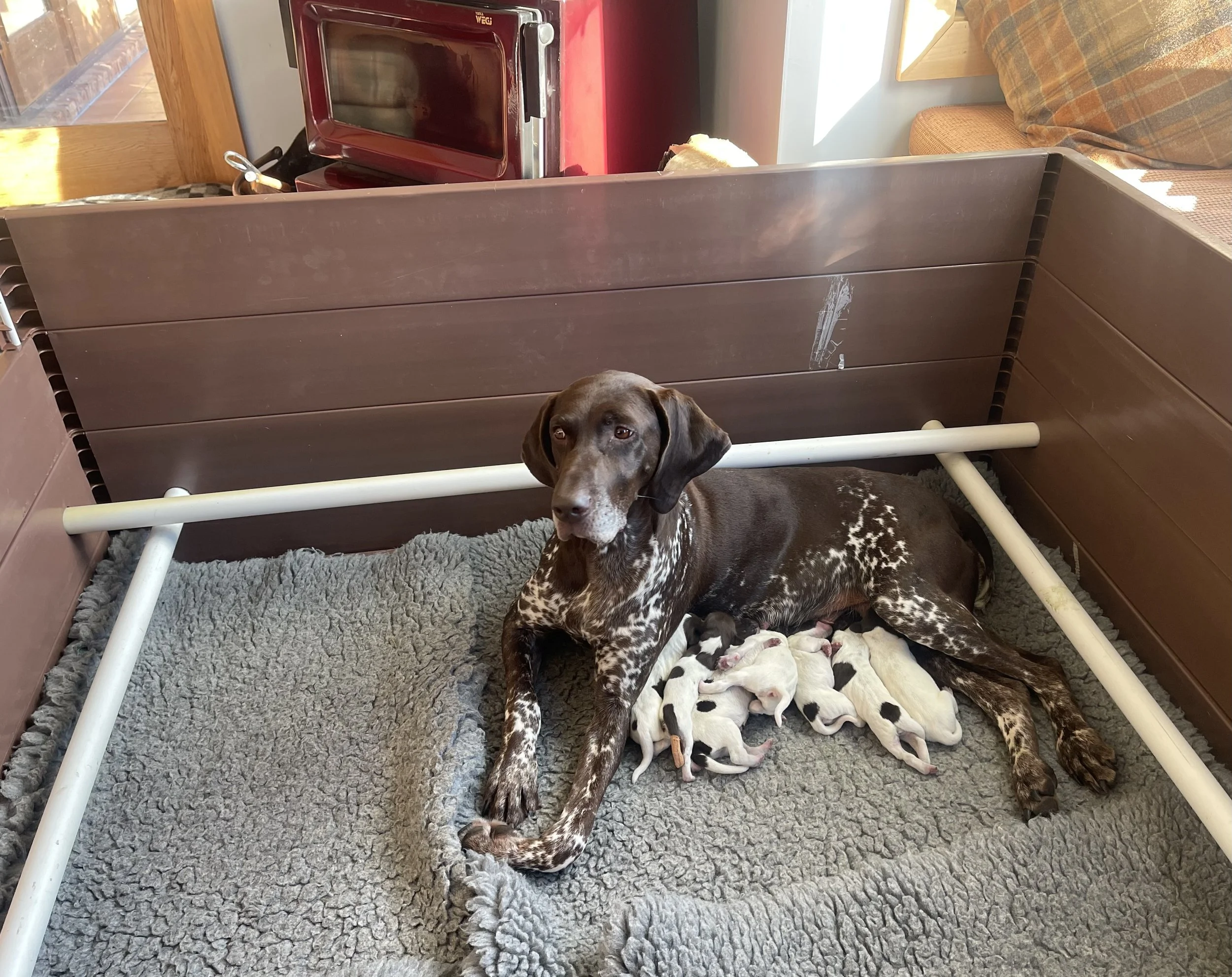Once she had decided, Karat didnt hang about and our “S” Litter arrived 3 days early, Friday 23rd May, apparently a common thing with litters born from surgical AI. Arriving in our kitchen with warmth from the woodburner, the 3 bitches and 4 dog puppies are all feeding well and very content. We are very excited to have such lovely homes lined up and we would like to thank everyone on our waitlist for being so patient and Lucie will be in touch by the end of Monday latest. !! many thanks for the wonderful interest in this litter - all puppies are reserved.