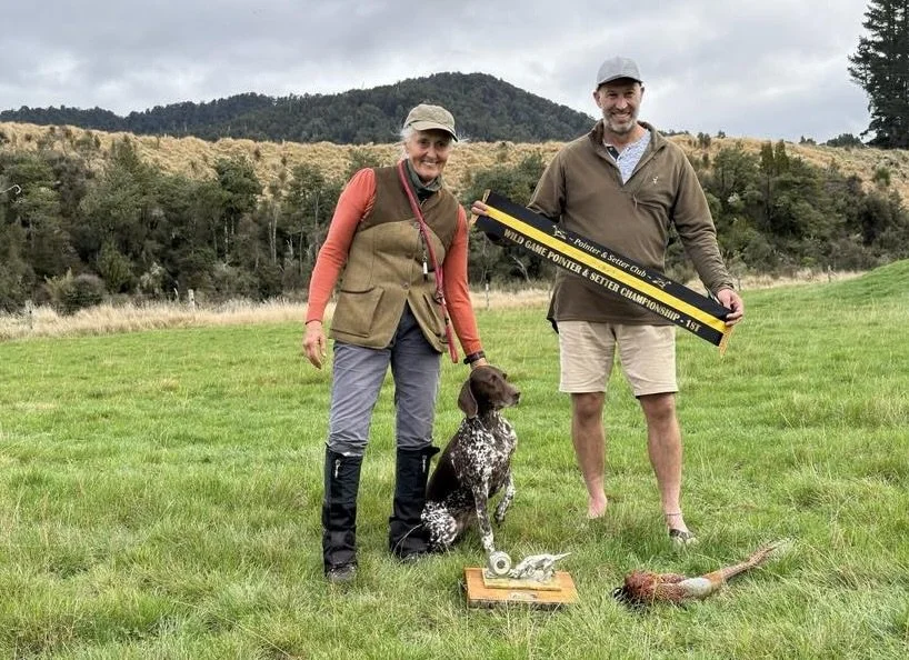 A day of Pointer and Setter Club Natural Game Trials at Poronui Station ran this weekend as Cyclone Vaianu moved in on NZ. Emergency weather warnings had reduced trials days from 2 to 1, actual trials from 4 to 2 and the running list to just seven, but oh, the fabulous hunting grounds of rough white grass, steep covered banks, rushes, streams and fallen trees allowed many of the new season birds to keep our braced runners busy, constantly tricking and tempting the dogs.